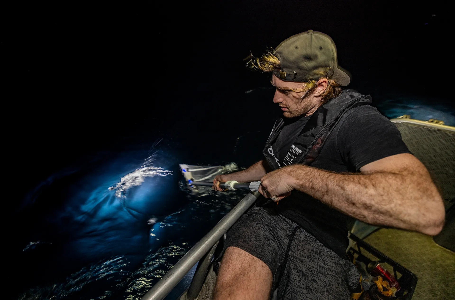 Nico Briggs, a research technician at the Australian Institute of Marine Science, skims the ocean for coral spawn with a modified pool net.