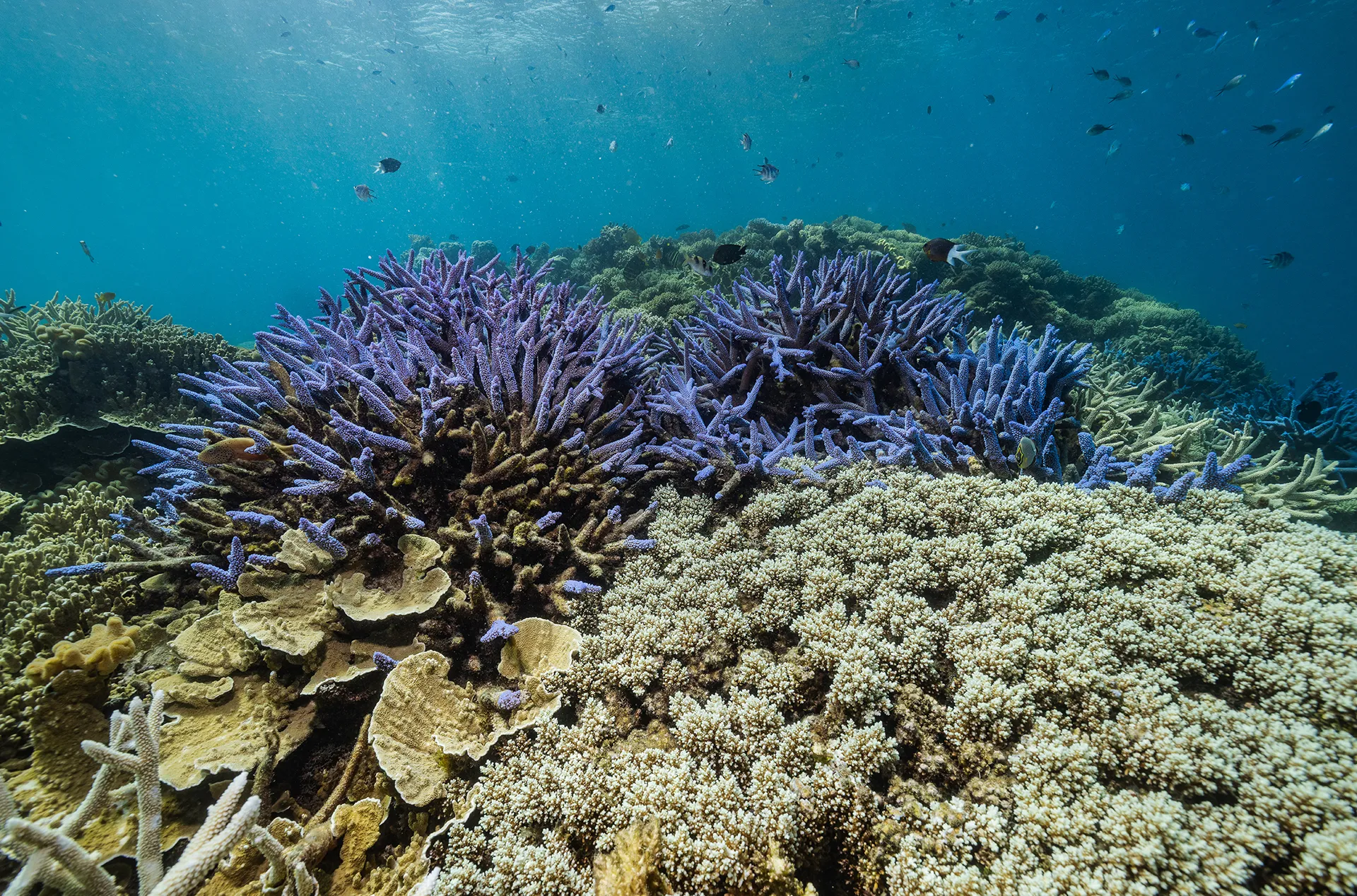 What really struck me was the color. Two decades of scuba diving had led me to believe that you can only find vivid blues, reds, oranges, and pinks in an artist’s imaginings of coral reefs, like in the scenes of Finding Nemo. But coral colonies on the reefs I saw here were just as vibrant. Some of the colonies of the antler-like staghorn coral were so blue it was as if they had been dipped in paint.