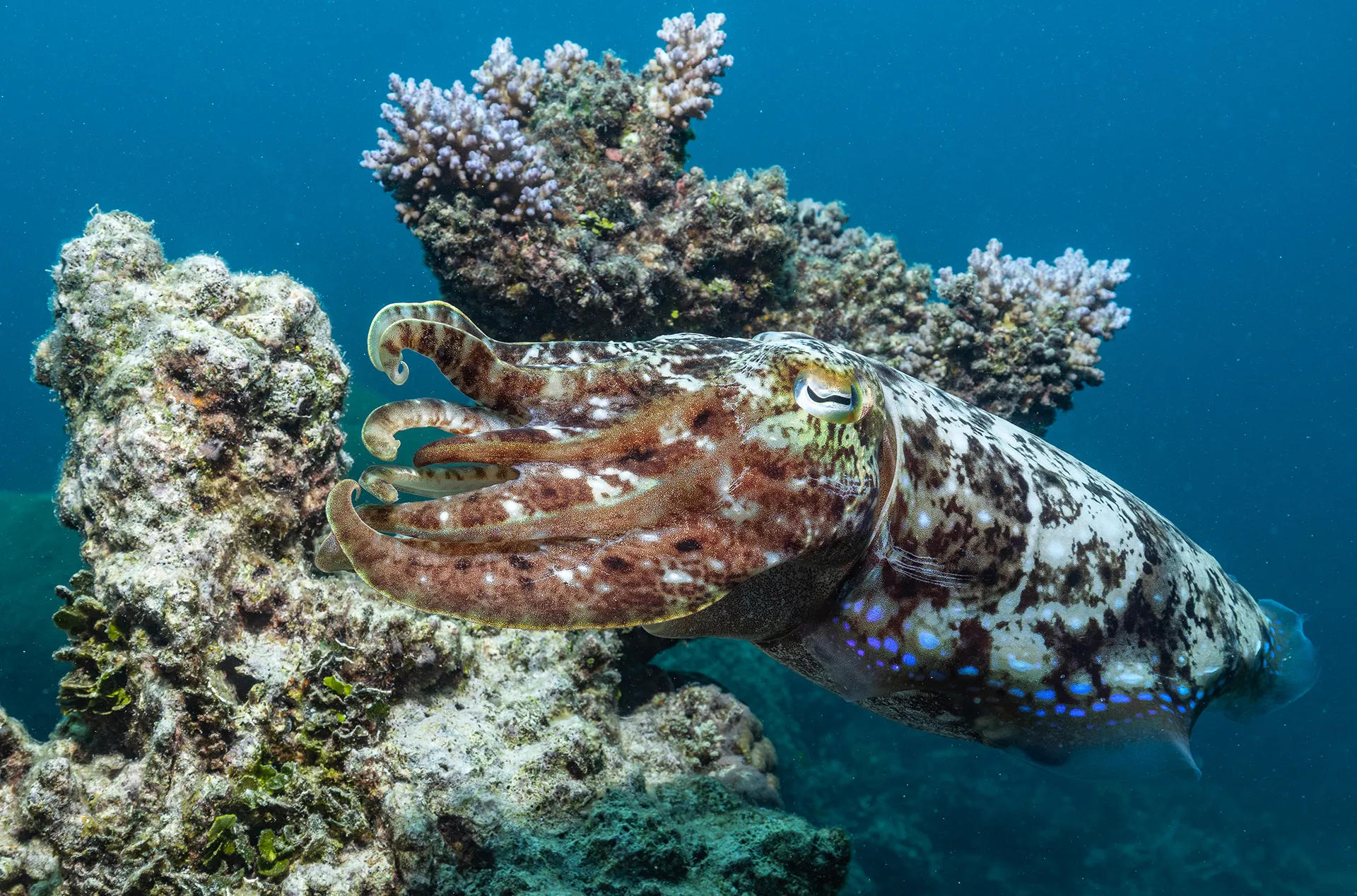 Staghorn coral often appears in brilliant blue.
