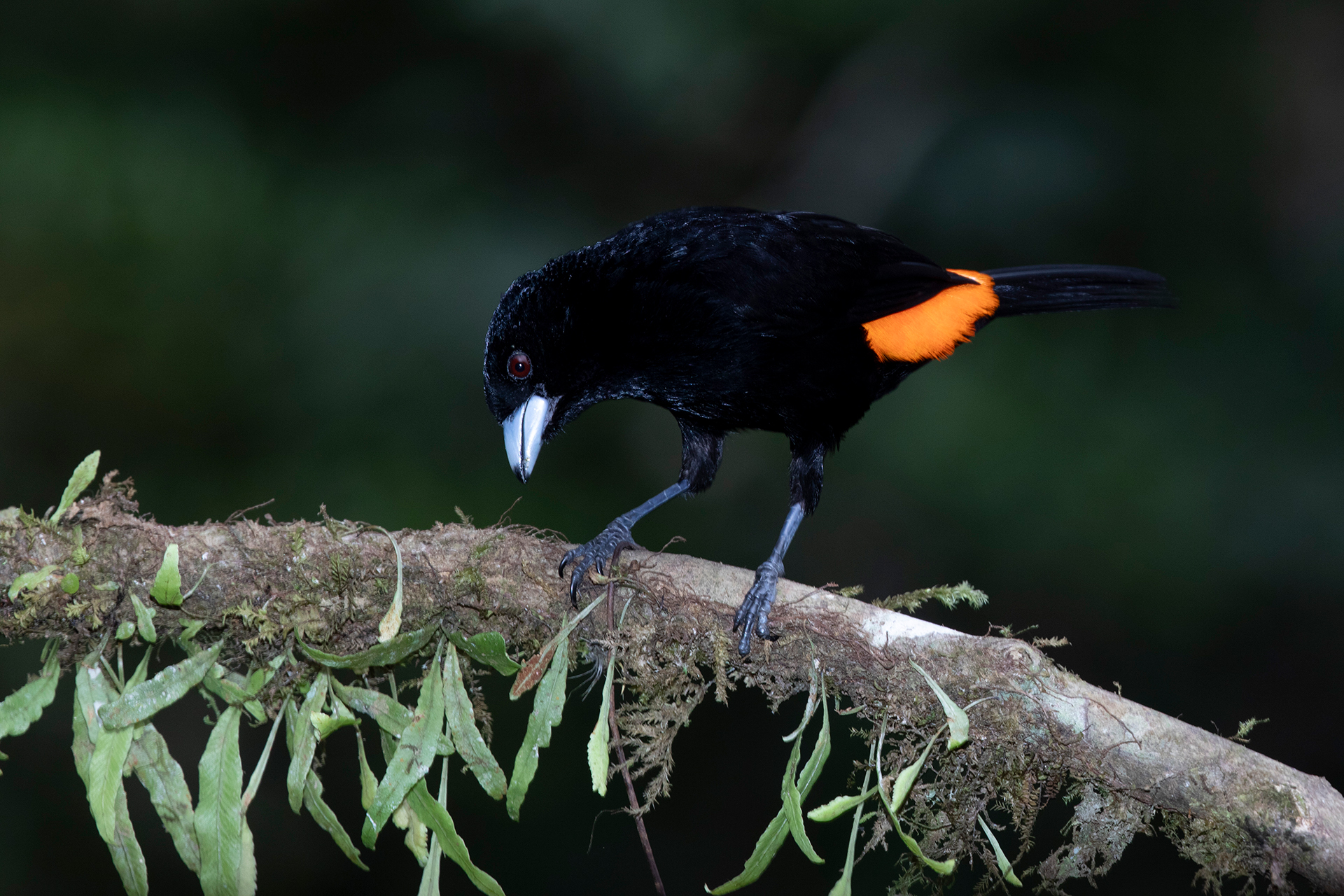 A flame-rumped tanager rests on a branch at La Florida, a birdwatching site near Cali.
