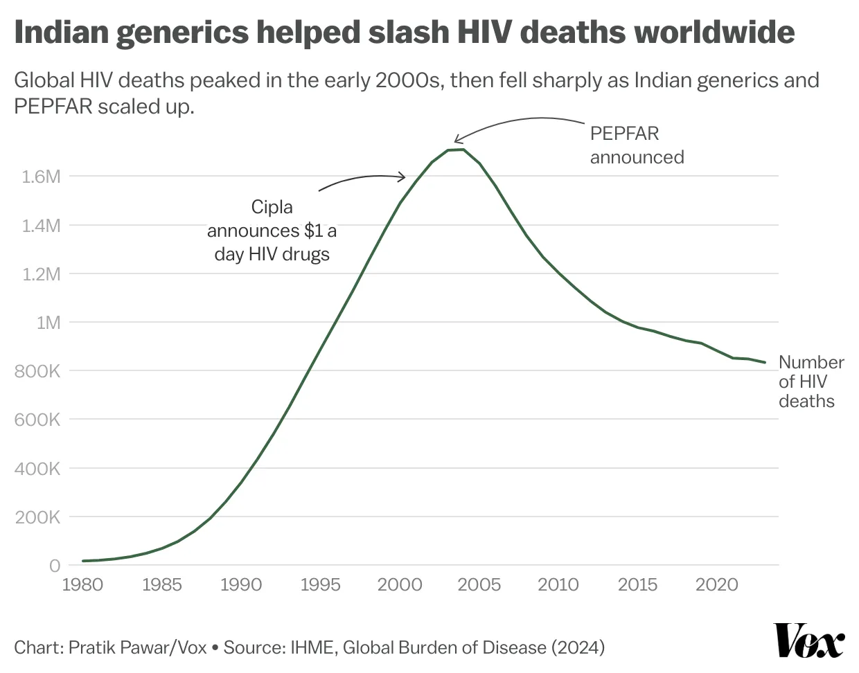 Indian generics would soon become the backbone of the global HIV response. Within two years, the US launched PEPFAR, the President’s Emergency Plan for AIDS Relief, a massive $15 billion program to deliver HIV treatment to sub-Saharan Africa and beyond. In the last two decades, that single program has helped save more than 25 million lives.